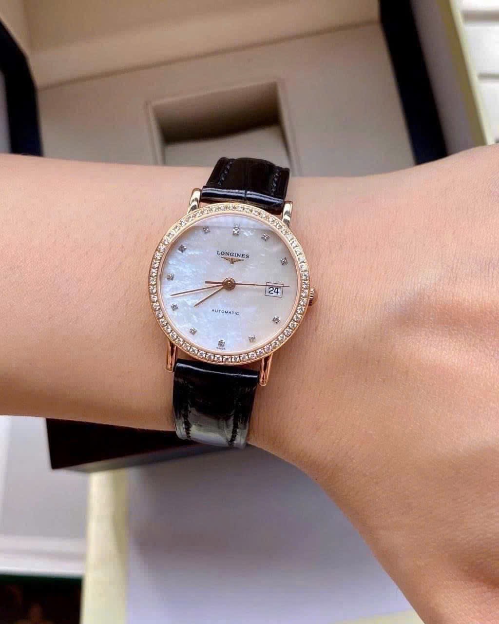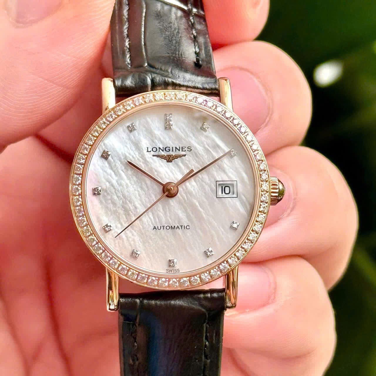 LG Elegant 18k Mother of Pearl Diamond 29mm Chiếc vàng khối 18k tuyệt đẹp mặt MOP và kim cương, size 29mm rất hiếm – Tình trạng: Lướt đẹp full box, 2 thẻ – Thân vỏ làm bằng vàng hồng 18k Au750 – Cọc số kim cương zin hãng, có thẻ chứng nhận kim cương đi kèm – Bộ máy Automatic L595/592 đời mới, trữ năng lượng lên đến 64h – Giá new gần 200tr qsd shop sale 78 tr